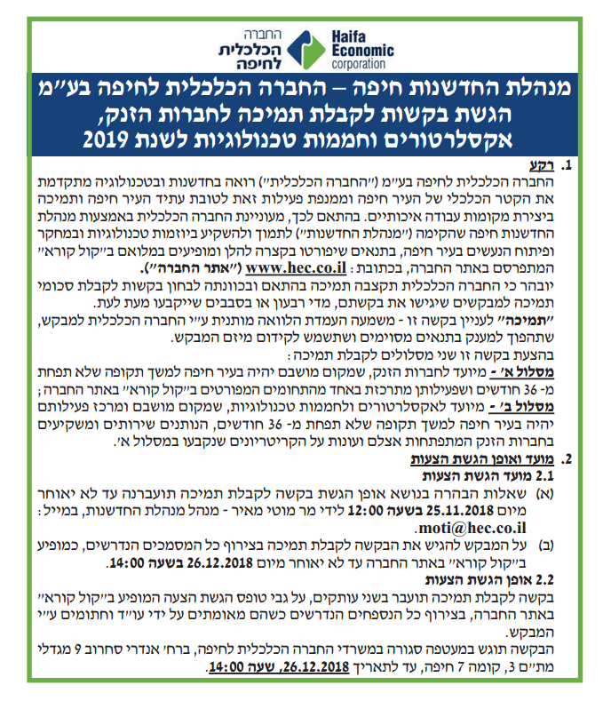 מנהלת החדשנות חיפה – החברה הכלכלית לחיפה בע"מהגשת בקשות לקבלת תמיכה לחברות הזנק, אקסלרטורים וחממות טכנולוגיות לשנת 2019