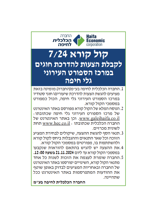 להגשת הצעות להשכרת אולמות ומתקני ספורט להפעלת חוגי ילדים ונוער במרכז הספורט העירוני גלי חיפה